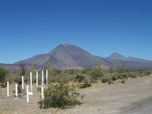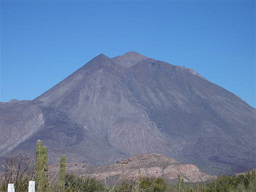 This is a photo of Volcan de las 3 Virgenes (the volcano of the 3 virgins). It is located near the E coast of Baja California, a region not usually noted for being volcanic. Volcan de las 3 Virgenes erupted last in the late 1700's. There were various old lava flows obvious from the road and sprinkled the area.