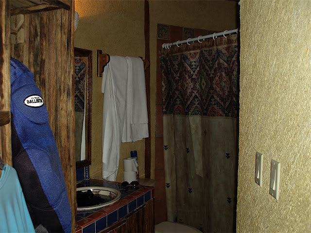 This is a shot of the bathroom area. notice the 2 rolls of toilet tissue, again a luxury, and towels hanging from a towel rack. oh how we take civilization for granted in this country. you can also see our clothes soaking in the sink. :-) the closet center was made out of cactus wood. i'm sure it was all custom as well. and it was beautiful.