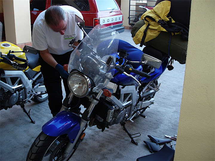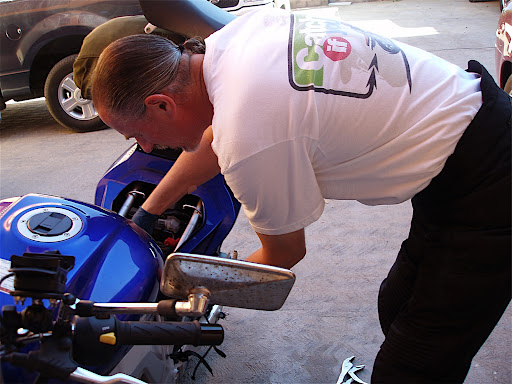 luckily our bikes are the same. his is a 2003, mine a 2004 so the parts are interchangeable. that really helped with diagnosing the problem. he figured out that the clutch-disengagement safety switch had been dislodged by a flying rock or something. once that was fixed we were ready.