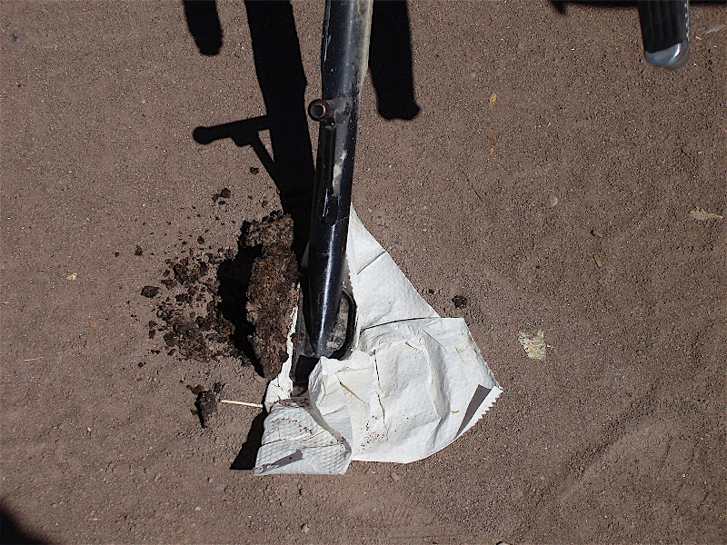 ye pulls over first, i'm sliding in behind him and know the ground in these pull outs can be quite soft. i slow and begin to look for something solid to put my kickstand on so i don't end up trying to hold my bike up. . .i find a nice piece of what i think is cardboard. when i flip my kickstand down, the cardboard, which is actually a paper towel flips up and what do you know!