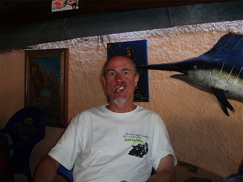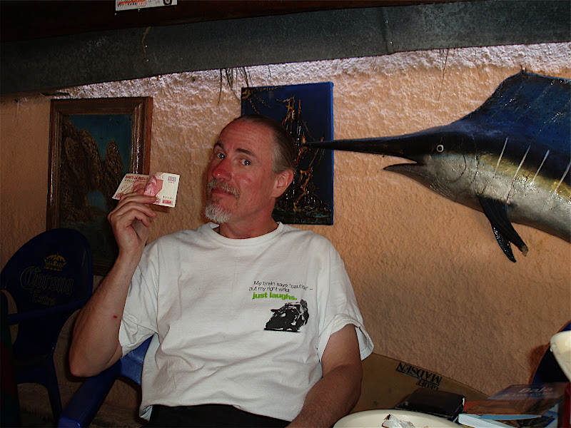 so we whipped around, dismounted and entered the cafe. it was a sand lot between two houses with a palapa roof. it was cool and dark and smelled divine. fish tacos was first and foremost on our minds.